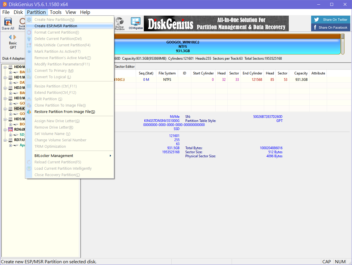 到上面的 Partition 選單選擇「Creat ESP/MSR Partition」功能,建立磁碟分割給未來 UEFI 開機資料區使用: